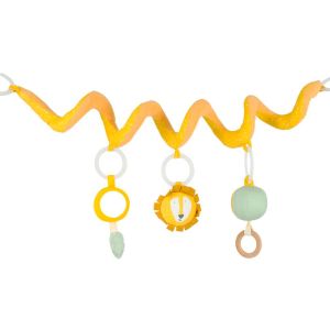 El juguete espiral de Trixie tiene tres elementos de actividad diferentes que divertirán a tu pequeño.Se puede enrollar alrededor de cualquier manillar de cochecito o de un parque infantil. Contiene un anillo de madera, papel arrugado, un espejo y una campanita para que tu hijo juegue donde quiera que vaya.